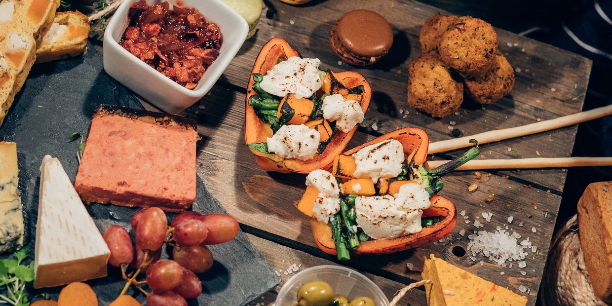 Crusty rolls with whipped herb butter; crisps; Provençale of mixed olives; houmous & Italian breadsticks; sweet pea & pecorino arancini with herb aioli; rocket & parmesan salad with balsamic oil dressing; potato salad with chives, crème fraiche & lemon; spiced falafel, chilli & fennel pastry rolls; roasted peppers filled with squash, chickpea, ricotta, toasted pumpkin seeds & watercress with balsamic glaze; chocolate torte with boozy berries; IOW cheese board with crackers & chutney